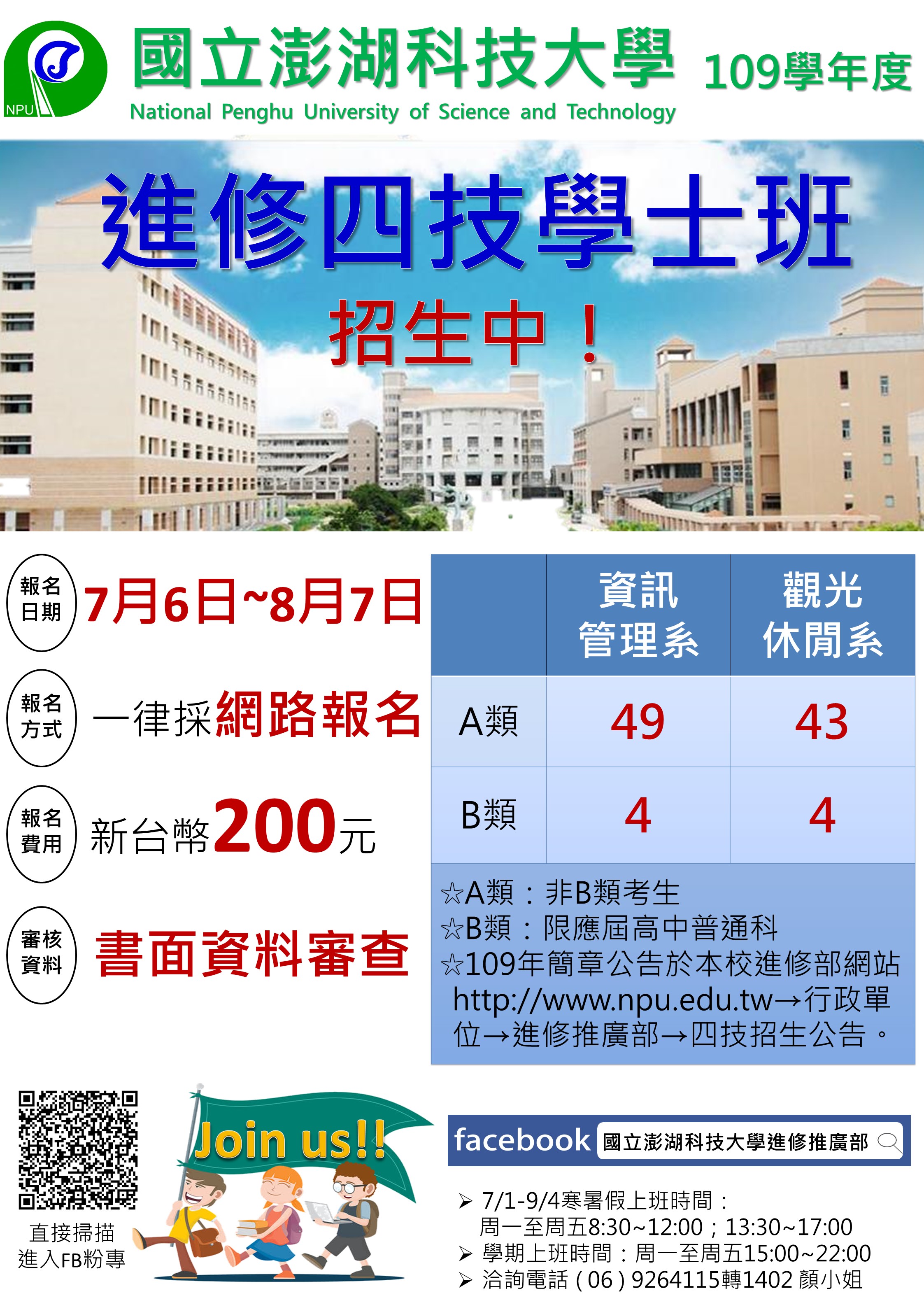 三、報名時間:109年7月6日(星期一)08:00分起至8月7日(星期五)17:30分止。