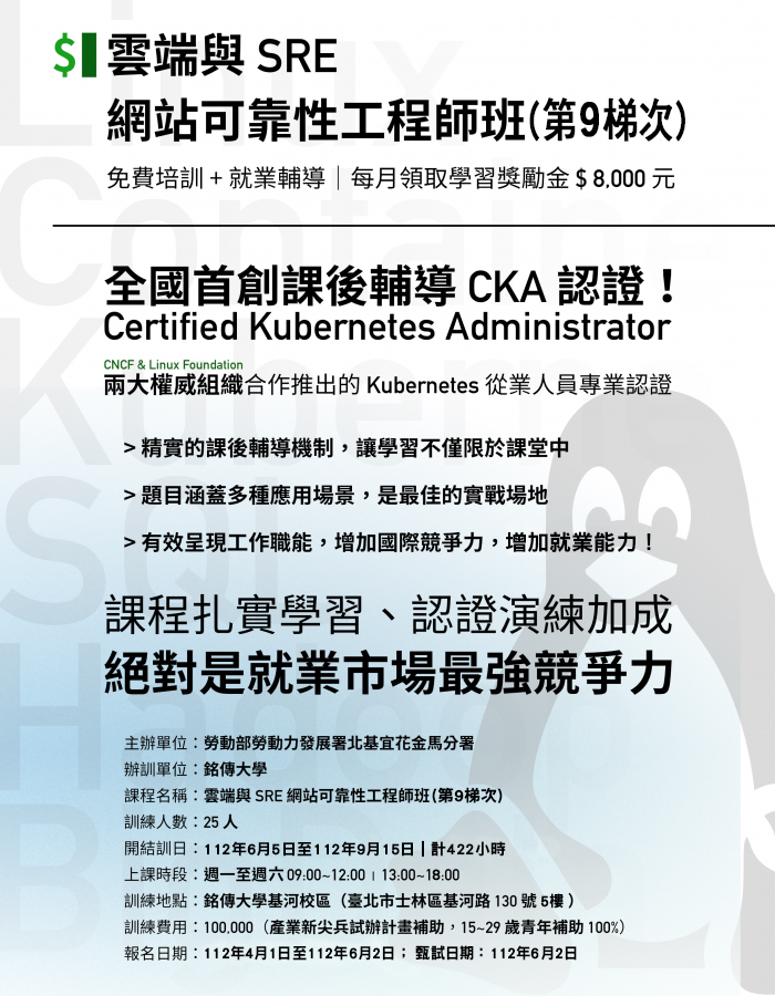 銘傳大學辦理勞動部「產業新尖兵試辦計畫」雲端與SRE網站可靠性工程師班(第9梯次)