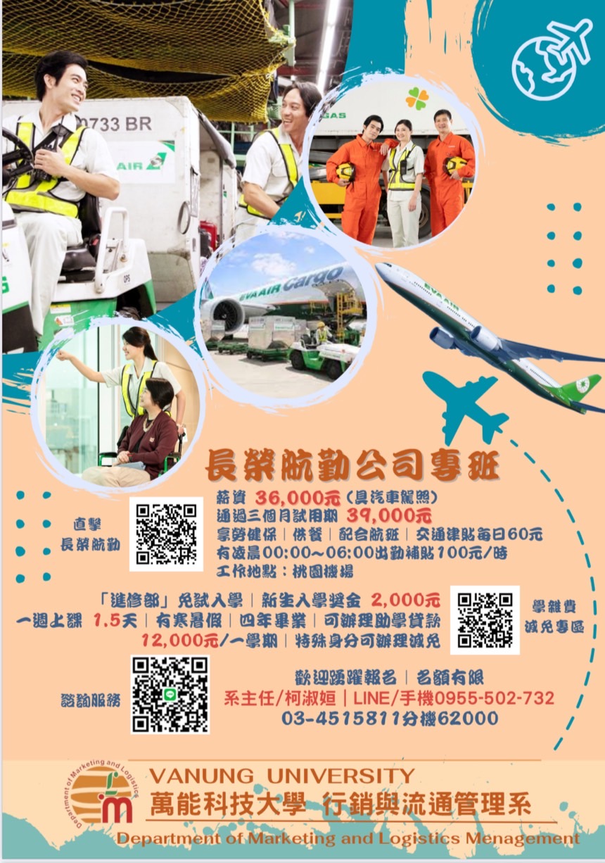 明:一、行銷與流通管理系為協助高中職學生進行職涯規劃,並瞭解航空產業最新發展現況,特別與長榮航勤公司合作辦理說明會。二、本次活動邀請長榮航勤公司高階主任及人事主管,藉由分享目前工作環境及內容,作為學生升學與職涯規劃的參考。三、考慮對學生助益,本活動以高三生優先,對此說明會有興趣或問題,歡迎來電洽詢輔導室。