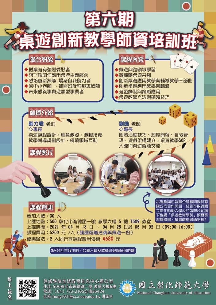 主旨:檢送本校進修學院「第六期桌遊創新教學師資培訓班」非學分班招生簡章,敬請惠予公告周知並鼓勵所屬人員踴躍報名參加,請查照。