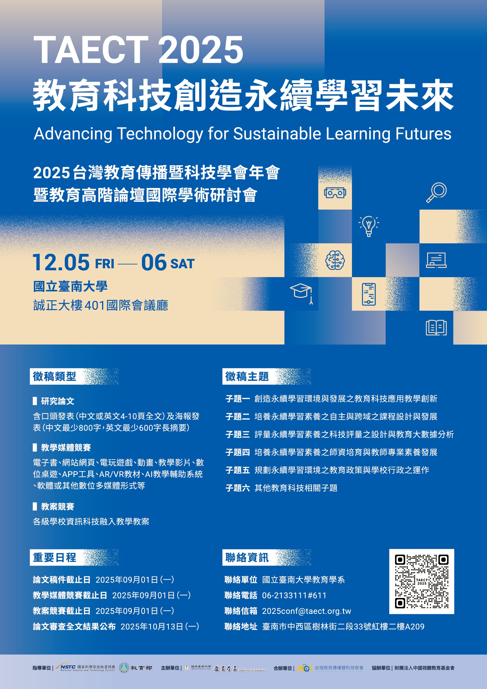 國立台南大學教育學系辦理「2025 台灣教育傳播暨科技學會年會暨教育高階論壇國際學術研討會」相關徵稿資訊