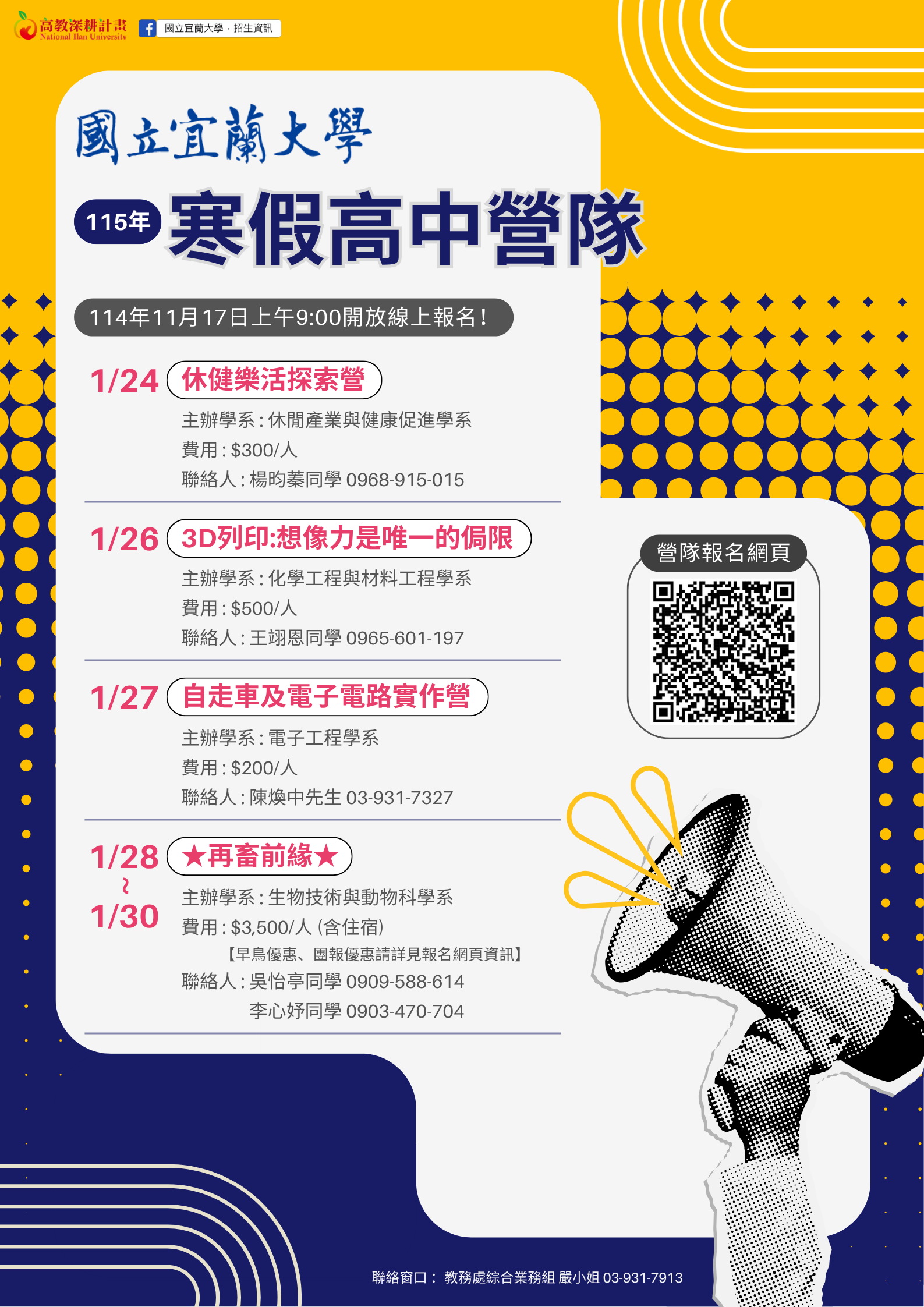 說明:一、檢附活動海報乙份,完整訊息請至活動網站(網址:https://sites.google.com/ems.niu.edu.tw/115winter),或由國立宜蘭大學首頁(網址:https://www.niu.edu.tw)/招生資訊/在宜大夢想起飛/高中營隊查詢。二、如有任何活動問題,請與教務處綜合業務組嚴珮萱小姐聯繫,電話:(03)935-7400分機7913,信箱:phyen@niu.edu.tw。