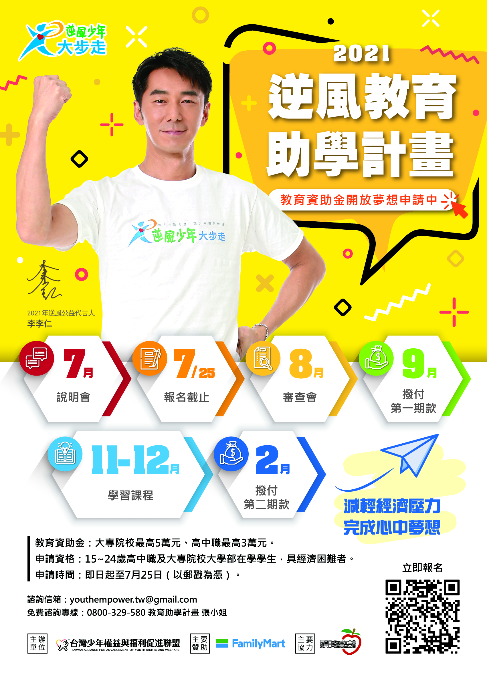 社團法人台灣少年權益與福利促進聯盟辦理「110學年度逆風教育助學計劃」招生海報電子檔