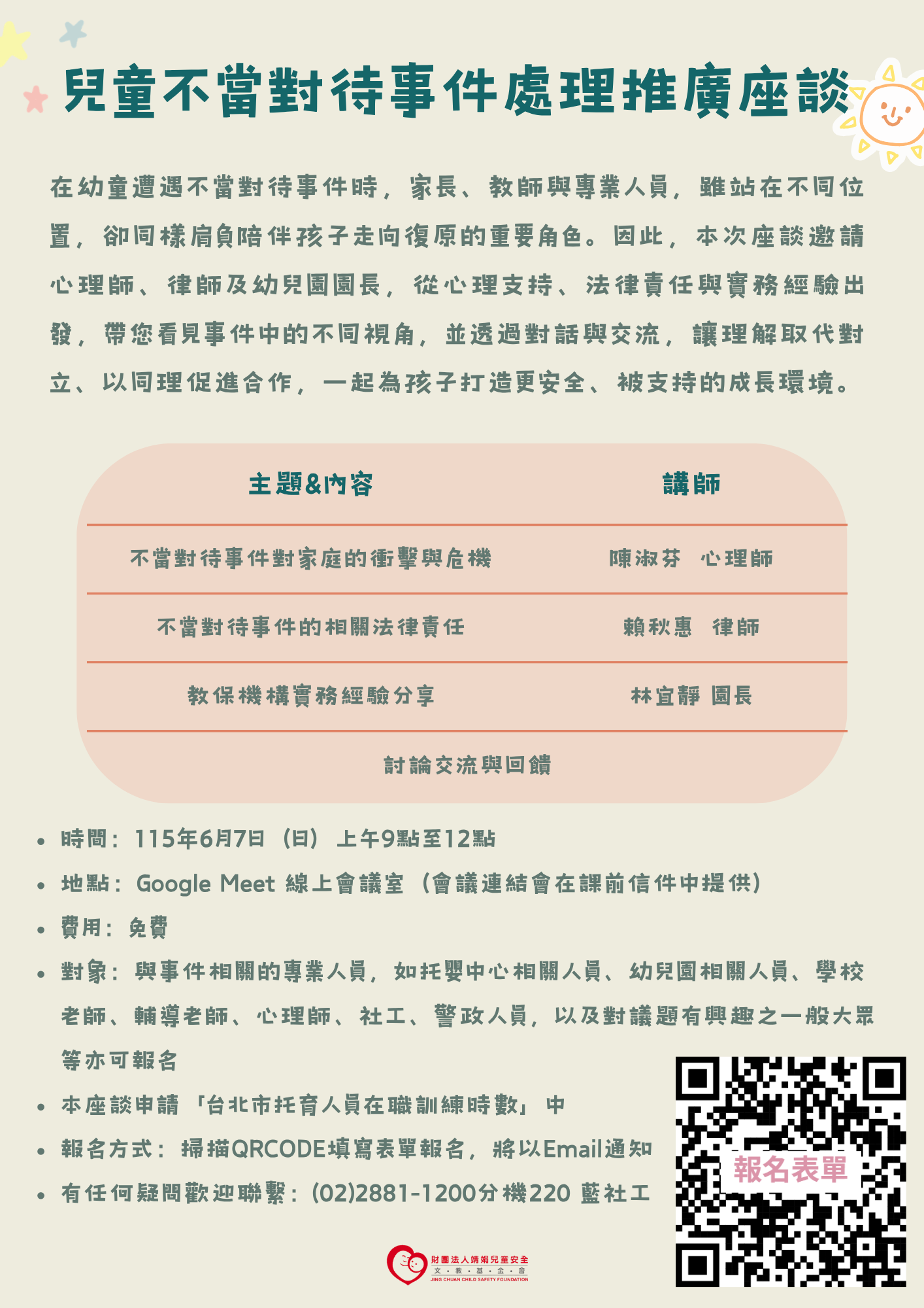 該會期待以兒童不當對待處理推廣座談,透過法律、心理、幼教實務經驗等專業,將不當對待事件處理經驗分享予相關人員,一同為孩子謀求最大的利益。檢附「兒童不當對待事件處理推廣座談」單張各乙份。