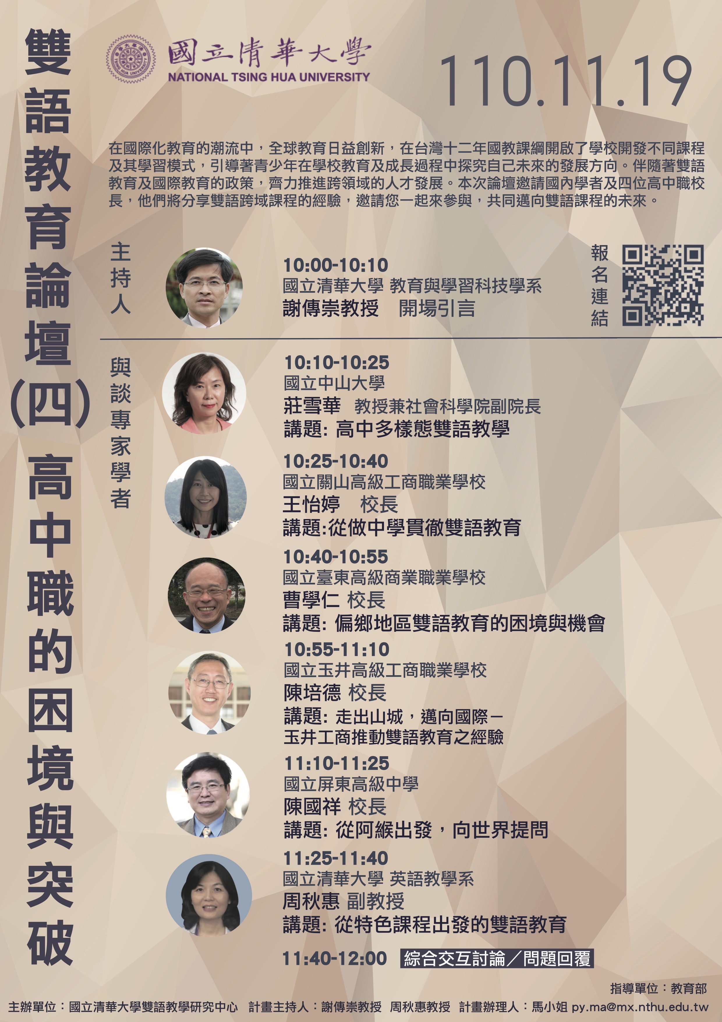 國立清華大學訂於110年11月19日上午10點至12點,辦理「雙語教育論壇(四):高中職的困境與突破」線上論壇