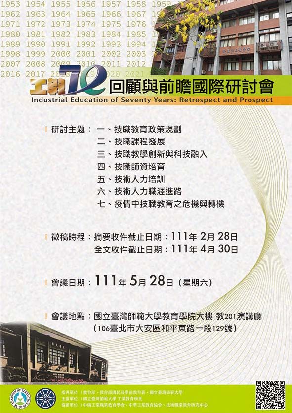 國立台師大工業教育學系訂於111年5月28日辦理「工教70回顧與前瞻國際研討會」,論文摘要徵稿延長至2月28日截止