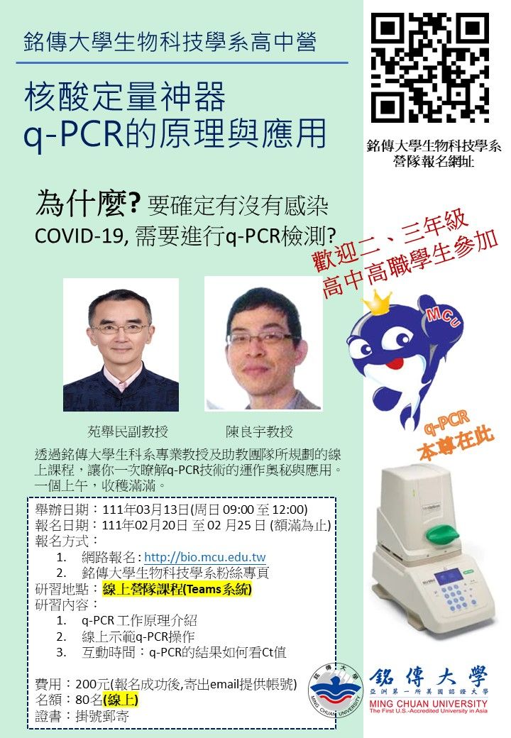 銘傳大學111年03月13日(星期日)舉辦高中生實習營「核酸定量神器q-PCR的原理與應用」