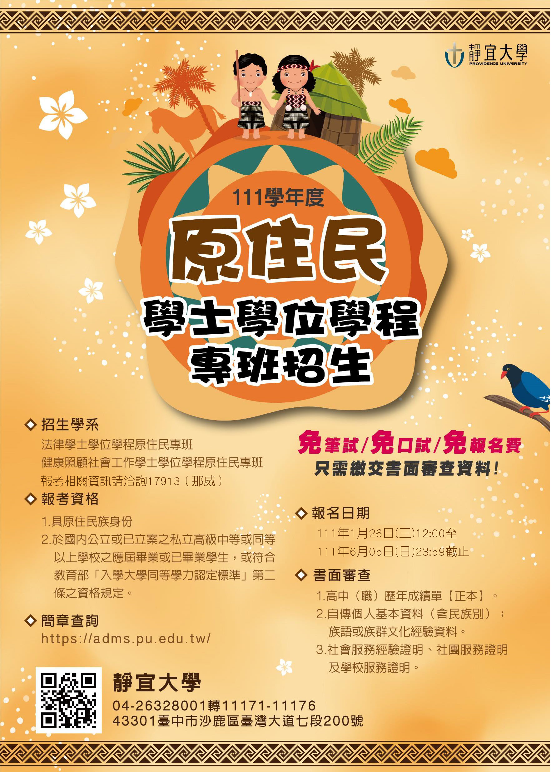 一、本校「111學年度原住民專班」共招收兩班,皆招收具原住民身份學生,相關規定請詳閱招生簡章。