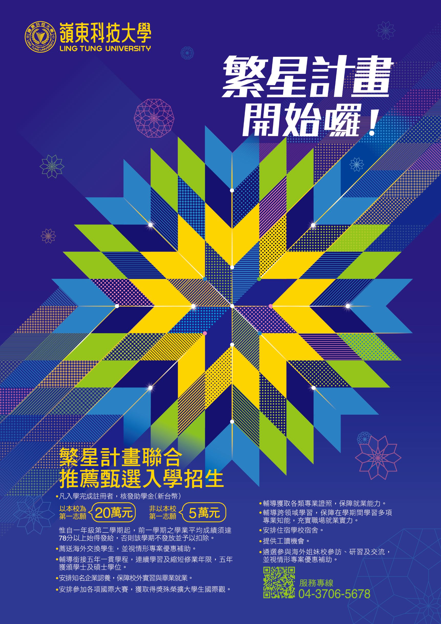 一、本校111學年度科技校院繁星計畫聯合推薦甄選入學招生計企業管理系、行銷與流通管理系、國際企業系、觀光與休閒管理系、應用外語系、財務金融系、會計資訊系、幼兒保育系、資訊管理系、資訊科技系、視覺傳達設計系、數位媒體設計系、創意產品設計系、流行設計系、服飾設計系、時尚經營系等16系,電子文宣如附件。
