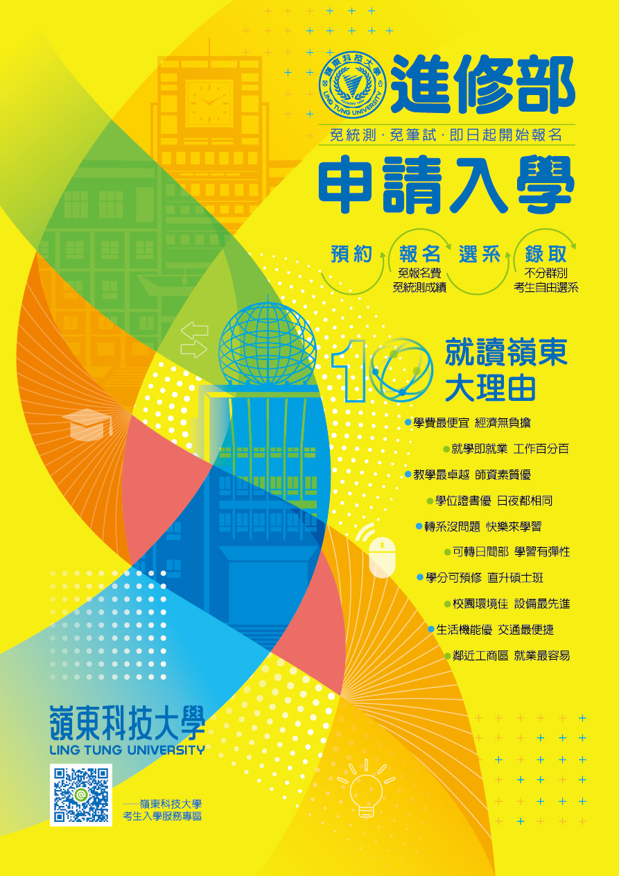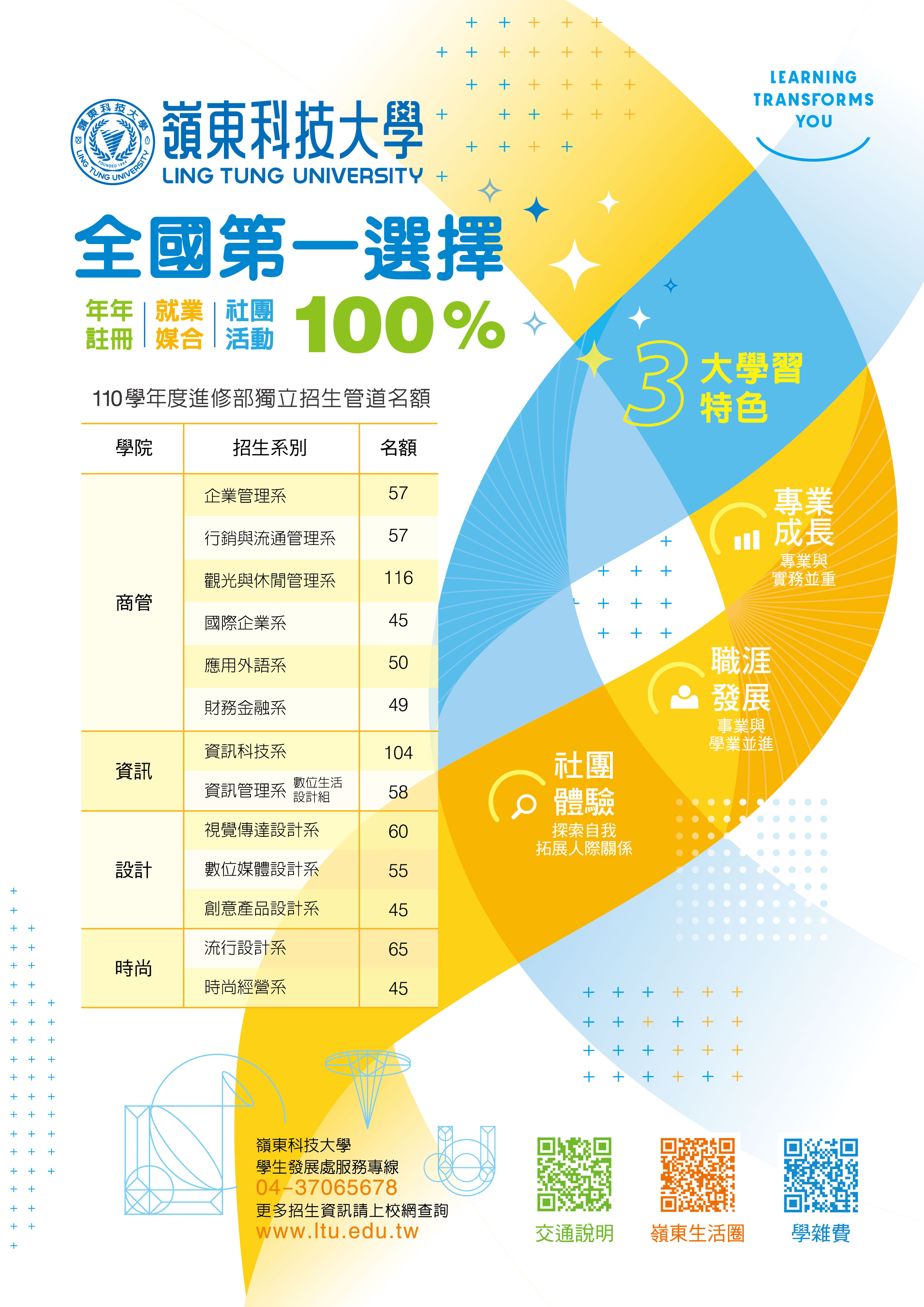 三、嶺東科技大學110學年度進修部獨招申請入學(免筆試),歡迎同學就讀,專案負責:學生發展處吳健中處長,服務專線:04-23849482;04-23892088#1234;04-37065678;0937567677。