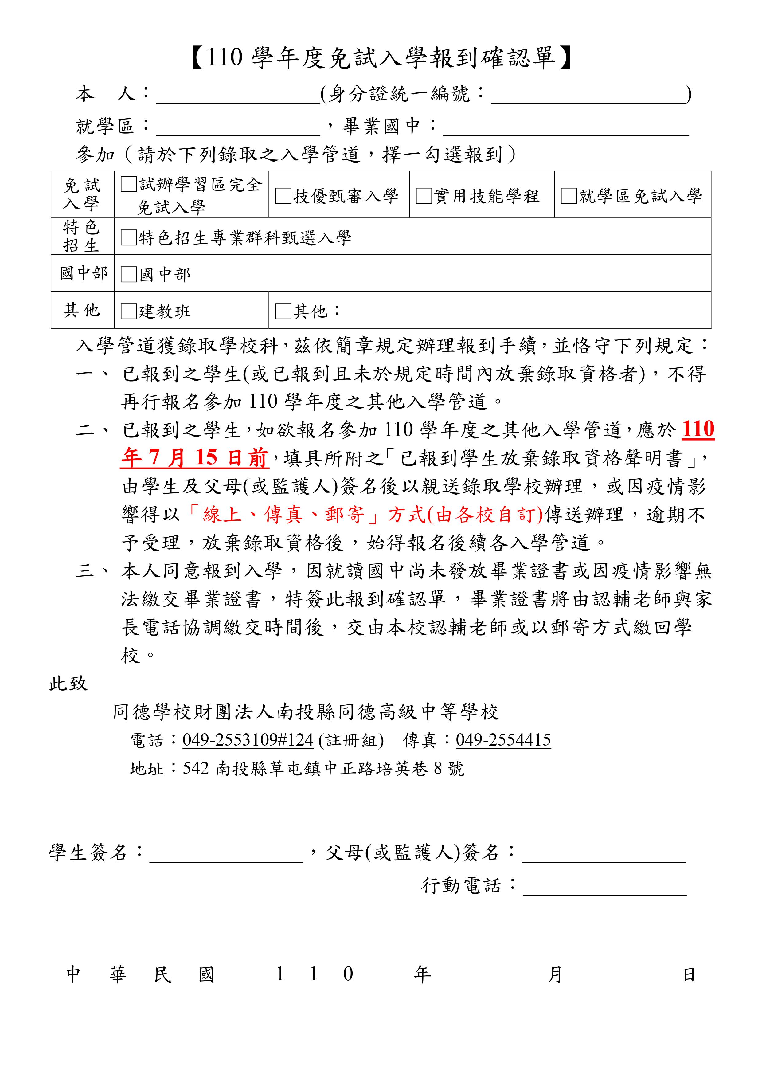 (如未收到報到確認單,可連結自行下載列印110學年度免試入學確認單)。