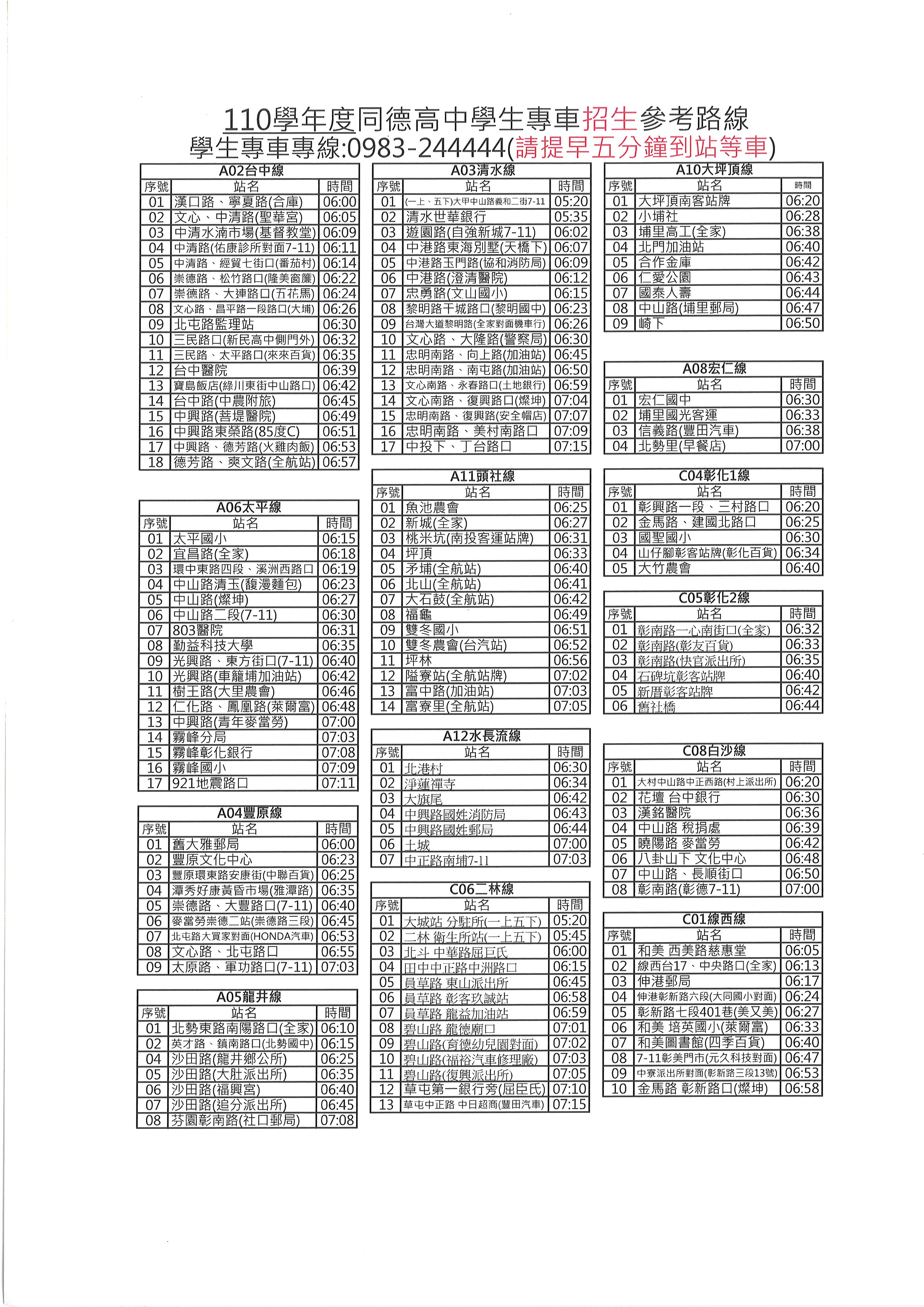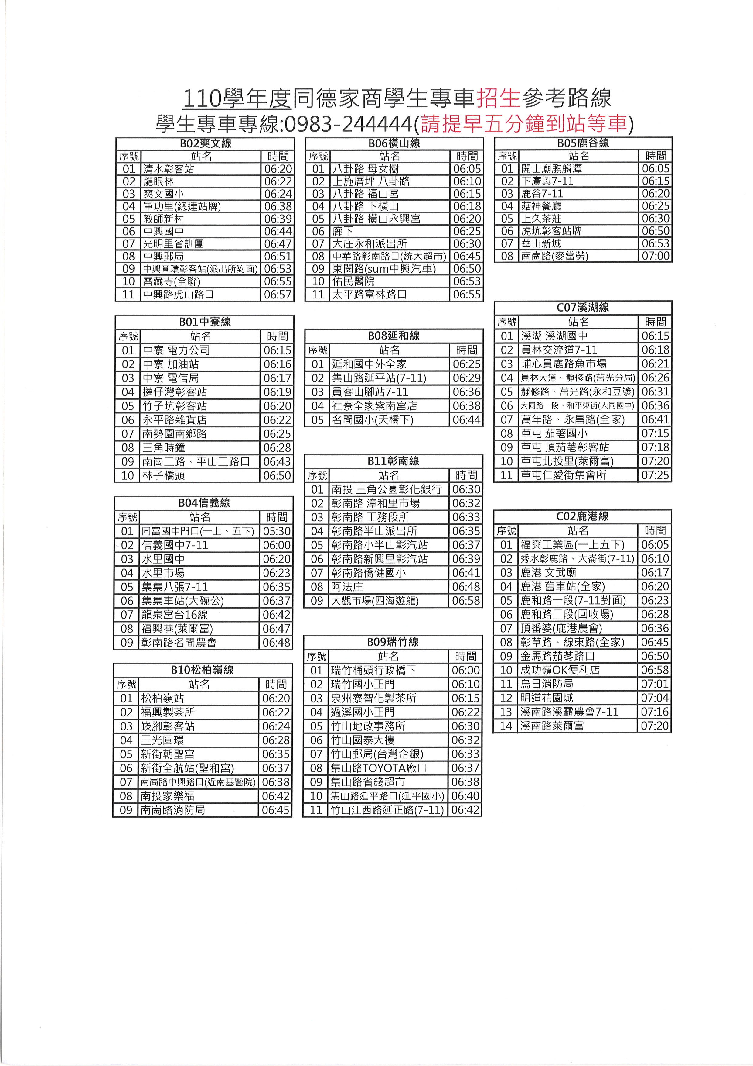 110學年度學生專車「新生參考路線」