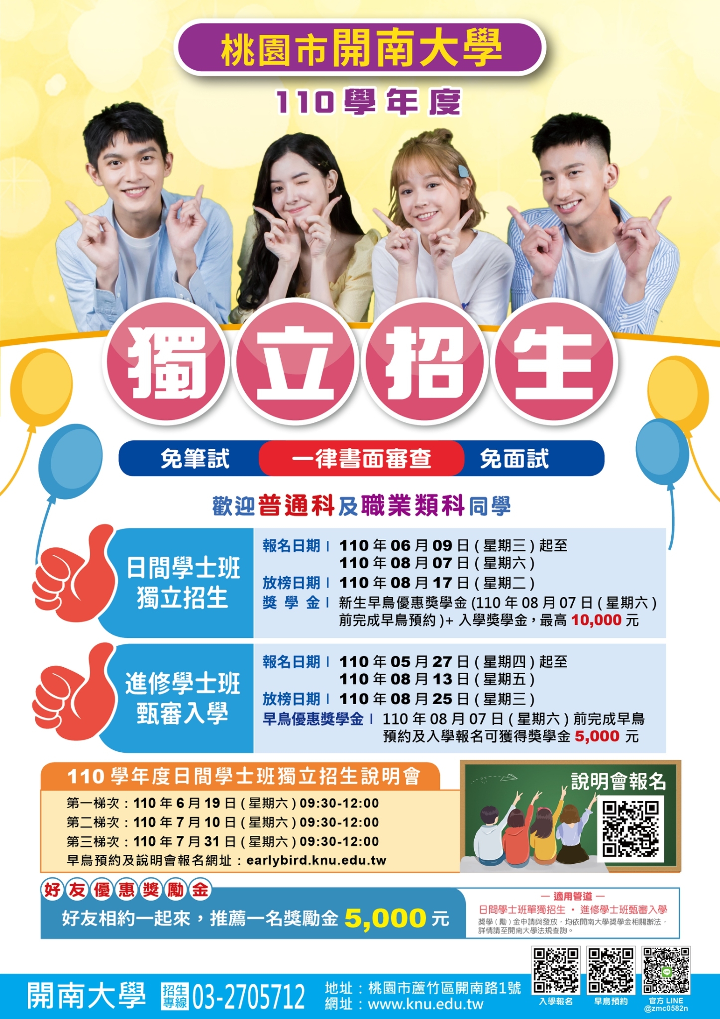 一、為落實多元入學理念,本校110學年度日間學士班單獨招生將於110年6月9日(星期三)開始報名;進修學士班甄審入學於110年5月27日(星期四)開始報名。