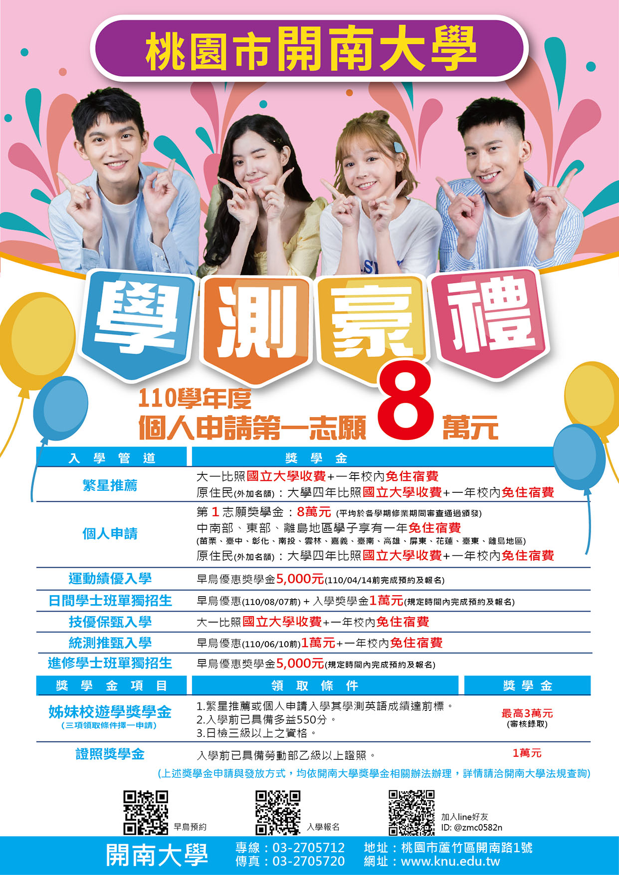 一、國立臺北大學自105學年度起於大學個人申請入學管道內增設「飛鳶組」招生,110學年度為第6年辦理,係透過降低學測檢定標準及佔分比、調降報名費等方式,優先考量經濟弱勢(低收、中低收、特殊境遇)持有證明,面對逆境卻積極向上之學生。詳細招生說明請參閱「110學年度大學個人申請入學招生簡章」第696-708頁。